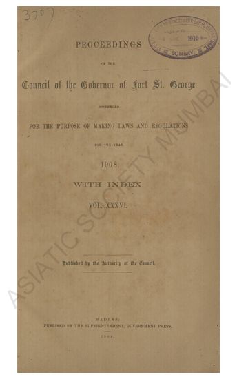 | Subject | : | Legislative proceedings of the Council of the Governor of Fort St. George, including laws and regulations discussed or passed during 1896. |