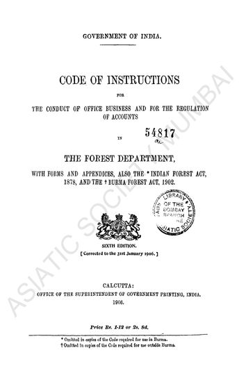 | Subject | : | Forest Department Code; Conduct of Office Business; Regulation of Accounts; Indian Forest Act, 1878; Burma Forest Act, 1902 |