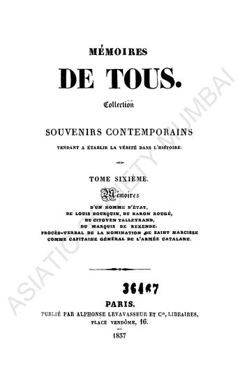 | Subject | : | Mémoires, Souvenirs contemporains tendant à établir la vérité dans l'histoire |