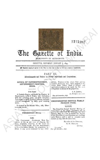 The Gazette of India, Part III, January 7 & 14, 1899.