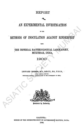Report on an Experimental Investigation of the Methods of Inoculation against Rinderpest, from the Imperial Bacteriological Laboratory, Muktesar, India, 1900