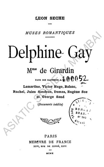 Muses Romantiques; Delphine Gay, Mme de Girardin, dans ses rapports avec Lamartine, Victor Hugo, Balzac, Rachel, Jules Sandeau, Dumas, Eugene Sue et George Sand