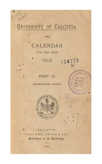 University of Calcutta. Calendar for Year 1913-Part IV. ...