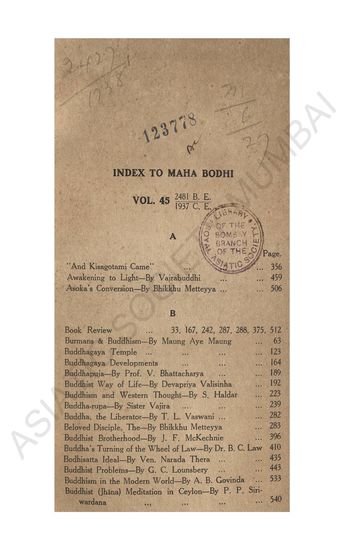 Maha-Bodhi The Maha- Bodhi Indix to Vol XLIII 1935….