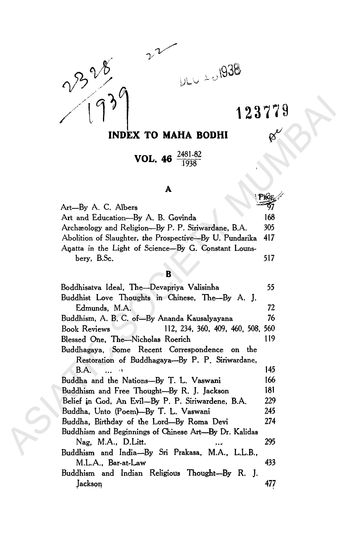 Indix to Maha- Bodhi Vol XLVI 1938….