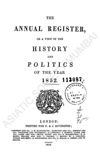 Annual register : or a view of the history, politics, and literature, for the year 1852.
