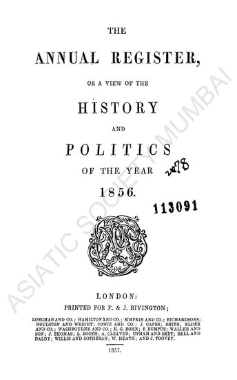 Annual register : or a view of the history, politics, and literature, for the year 1856.