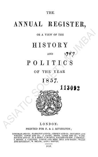 Annual register : or a view of the history, politics, and literature, for the year 1857.