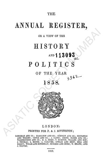 Annual register : or a view of the history, politics, and literature, for the year 1858.