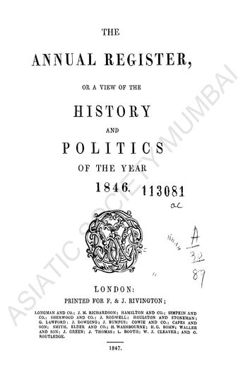 Annual register : or a view of the history, politics, and literature, for the year 1846.