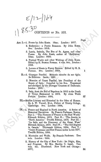 Edinburgh Review, or Critical Journal: for July. 1884... October. 1884. to be Continued Quarterly. Vol, CLX.