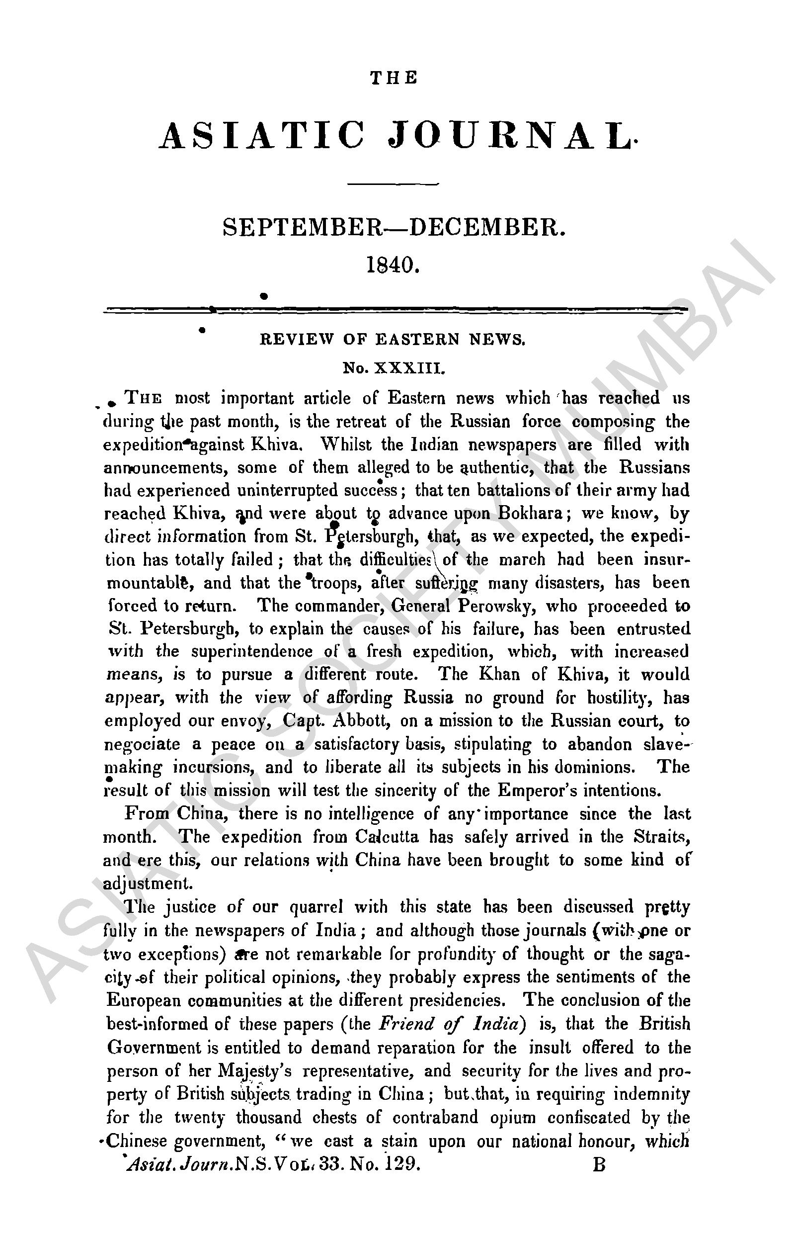Asiatic Journal and monthly register for British and foreign India, China, and Australasia, Vol. XXXI - New Series, January - April 1840.