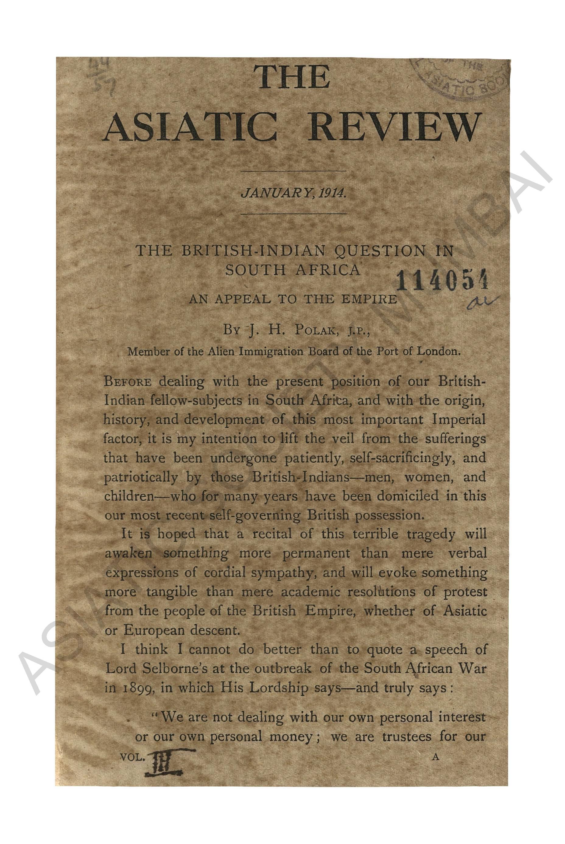 Asiatic quarterly review. Vol. I - New Series No. 1 & 2, January - April 1913.