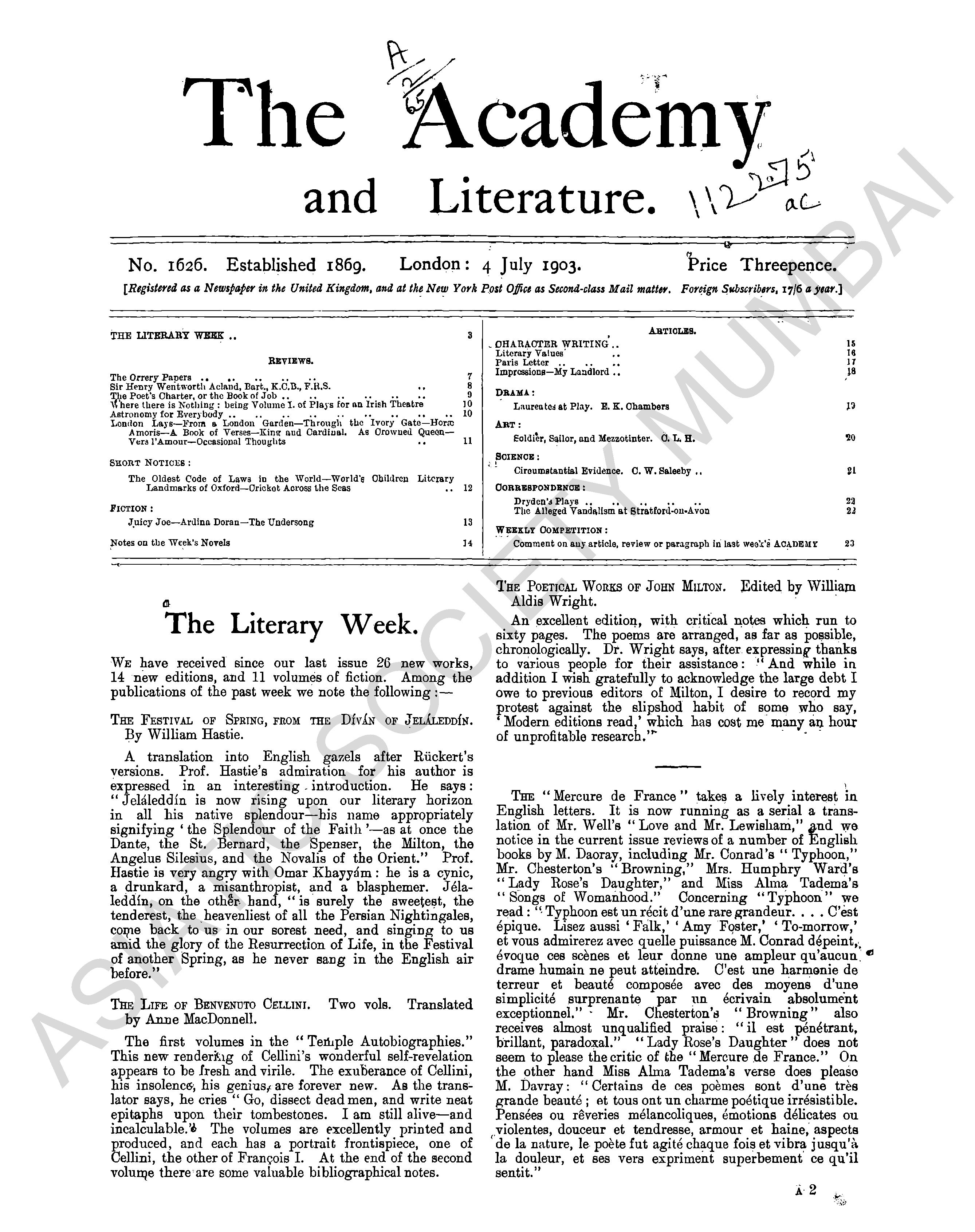 Academy a weekly review of Literature, Science and Arts, January - June, Vol. XXIII, 1883.