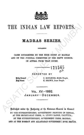 Indian Law Reports, Madras Series Containing Cases Determined by the High Court at Madras and by the Judicial Commtitee of the Privy Council on appeal from that Court. Vol. XV.- 1892. January- December.