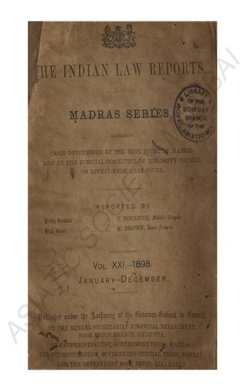 Indian Law Reports, Madras Series Containing Cases Determined by the High Court at Madras and by the Judicial Commtitee of the Privy Council on appeal from that Court. Vol. XXI.- 1898. January- December.