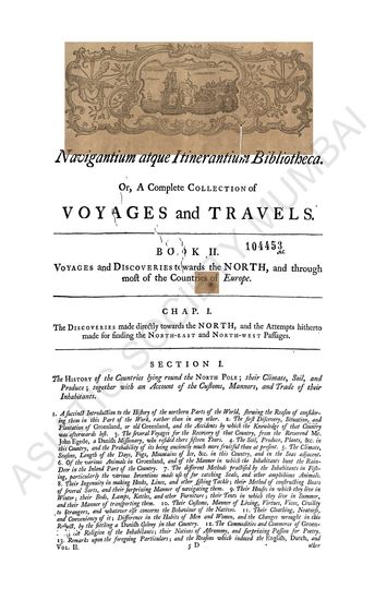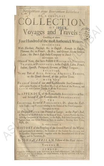 Navigantium atque Itinerantium Bibliotheca; or, a Complete Collection of Voyages and Travels; consisting of above Six hundred of the most Authentic Writers, beginning with Hackluit, Purchass, &c. in English; Ramusio, Alamandini, Carreri, &c. in Italian; Thevenot, Renaudot, Labat, &c. in French; de Brye, Grynaeus, Maffeus, &c. in Latin; Herrera, Oviedo, Coreal, &c. in Spanish; and the Voyages under the Direction of the East-India Company in Holland, in Dutch; together with such other Histories, Voyages, Travels, or Discoveries, as are in General Esteem; whether published in English, Latin, French, Italian, Spanish, Portuguese, High and Low Dutch, or in any other European Language; containing whatever has been observed Worthy of Notice in Europe, Asia, Africa and America, in respect to the Extent and Situation of Empires, Kingdoms, Provinces, &c.; the Climate, Soil and Produce, whether Animal, Vegetable or Mineral, of each Country : likewise the Religion, Manners and Customs of the several Inhabitants, their Government, Arts and Sciences, Publick Buildings, Mountains, Rivers, Harbours, &c.; illustrated by Proper Charts, Maps and Cuts, in Two Volumes, Vol. II