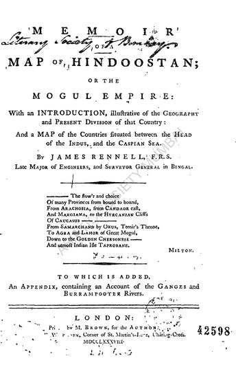 Memoir of a Map of Hindoostan; or, the Mogul Empire; with an Introduction, illustrative of the Geography and Present Division of that Country and a Map of the Countries situated between the Head of the Indus and the Caspian Sea; to which is added, an Appendix, containing an Account of the Ganges and Burrampooter Rivers
