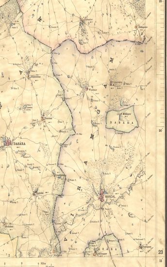 CONVENTIONAL SIGNS. Trigonometrical Stations & Points respectively Δ & ο or ό. Taluka Boundaries, Metalled roads, Country roads, Approximate, Foot paths, Cultivation, blank. Edge of Cultivation, Waste, Pahlias or In Memoriam stones †. Numerals without an affix indicate Trigonometrical heights in feet above mean sea level ; thus 365. Numerals with the affix P indicate the population of the town or village they are they are printed under, thus 472 P; with affix r they indicate the relative heights in feet of banks to beds of water courses, thus 12r. The Longitudes are referrible to Madras Observatory, Old Values viz. 80° 17' 21 , to which a correction of - 3' 1'' must be applied to reduce to the most recent value, viz., 80° 14' 20. Vide Nautical Almanac for current year. Heights to Dangarwari H.S., 97.97feet deduced from Diu Tidal Observations. Index to Numbers of Adjoining Sheets. |