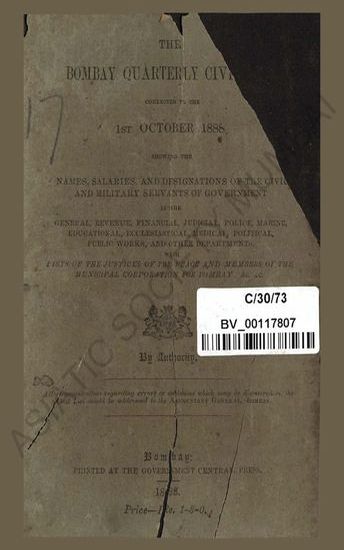 Bombay quarterly civil list corrected upto 1st October 1882, showing the names, salaries and designations of the civil and military servants of government.