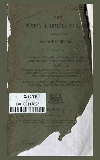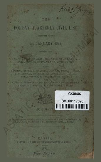 Bombay quarterly civil list corrected to the 1st April 1892, showing the names, salaries and designations of the civil and military servants of government.