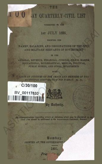 Bombay quarterly civil list corrected to the 1st January 1895, showing the names, salaries and designations of the civil and military servants of government.