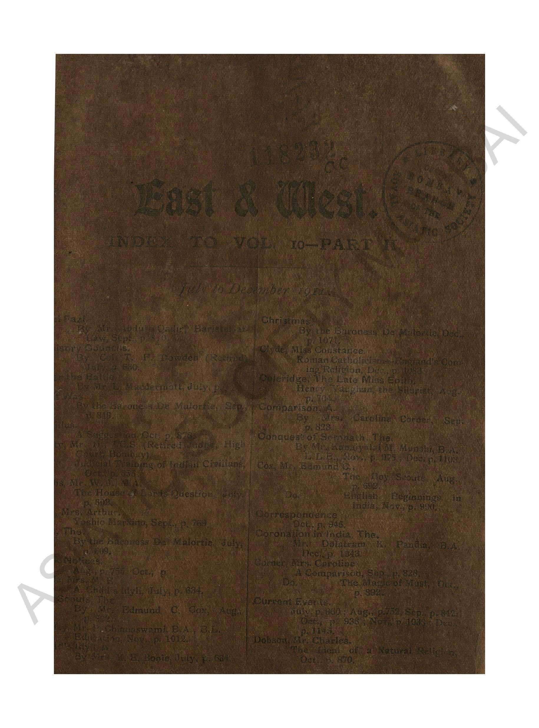 East and West 1910; Vol. X, No. 117 Part - II.
