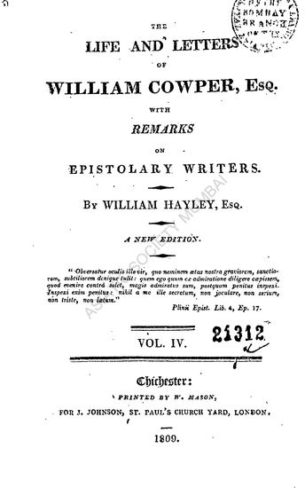The Life and Letters of William Cowper, Esq with Remarks on Epistolary Writers in 4 Vols.(Vol.III)
