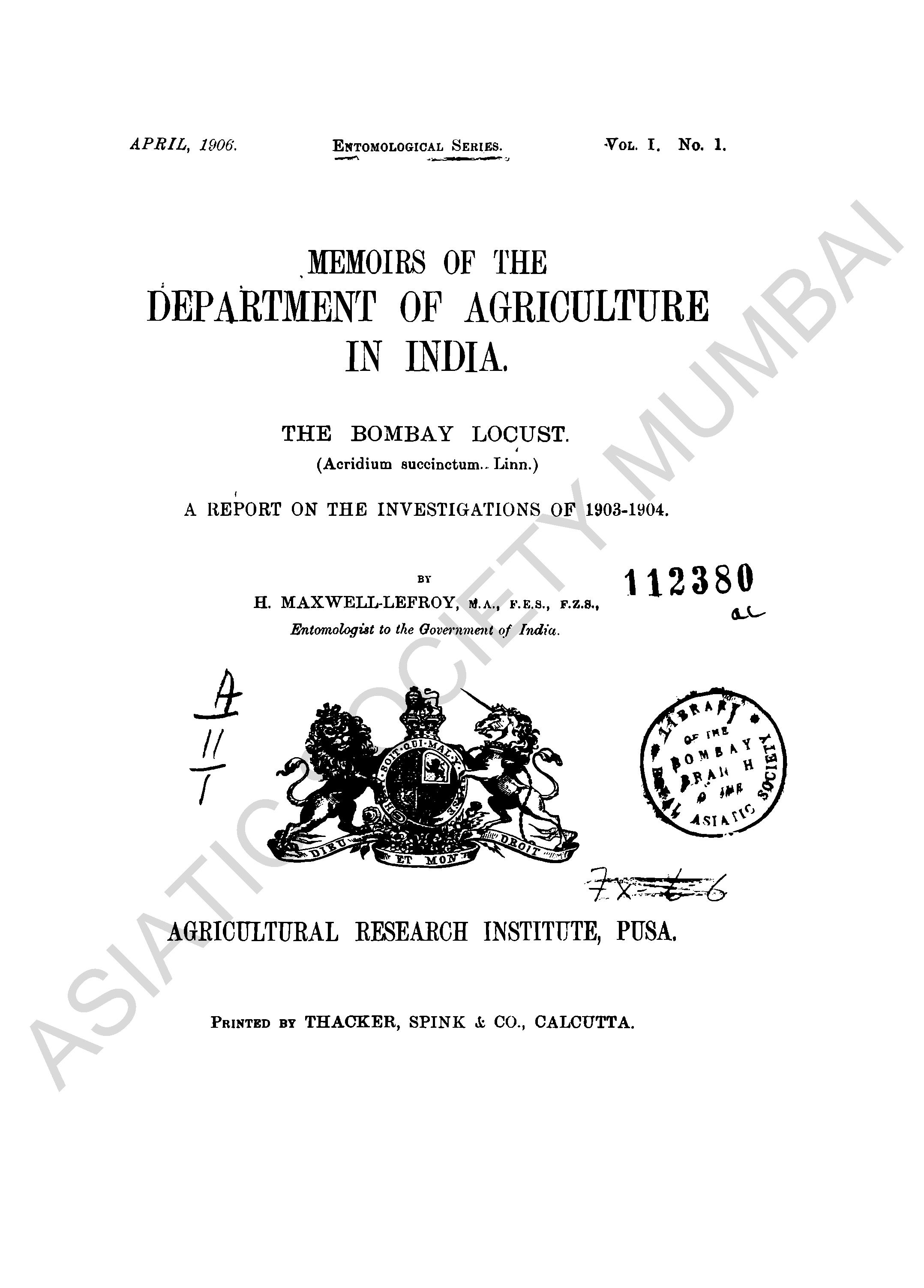 | Series | : | Entomological Series, Vol II, No. 1 |