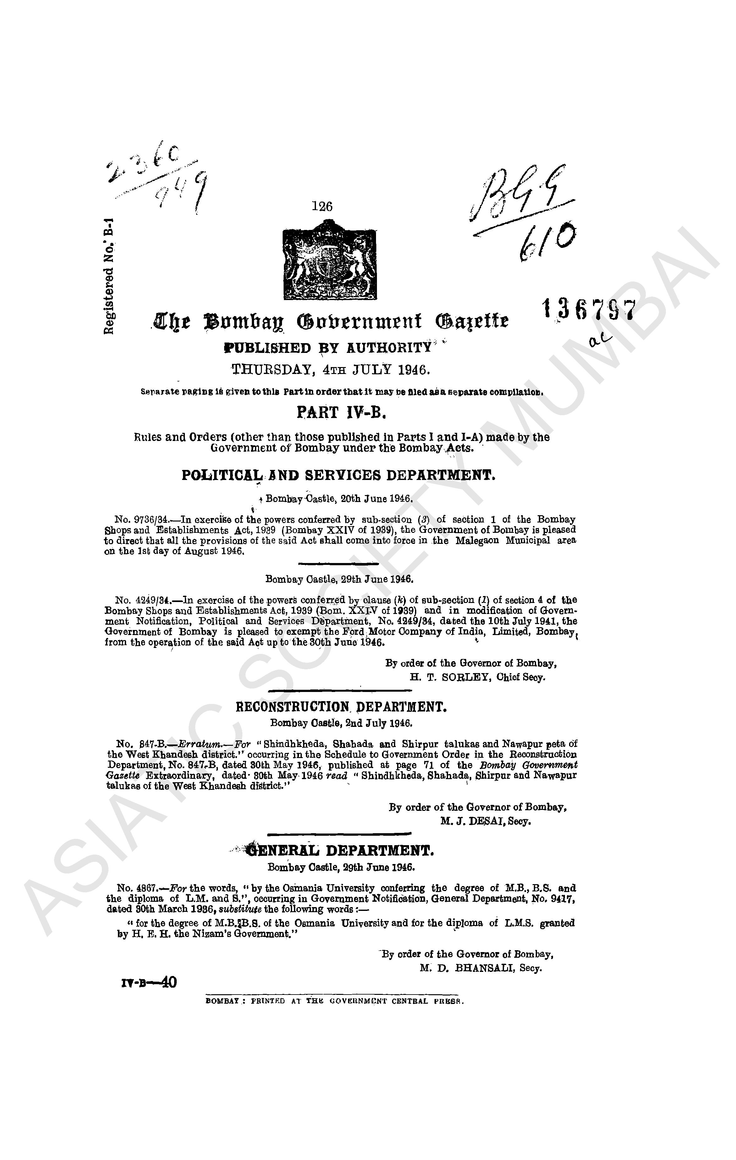 Bombay Government Gazette..., July to December 1946, Pa ...