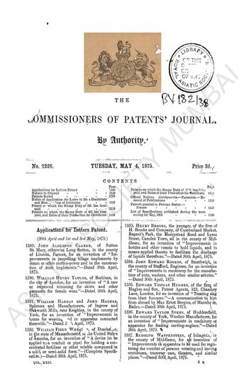 Commissioners of Patents Journal. Tuesday, May 2, 1873.
