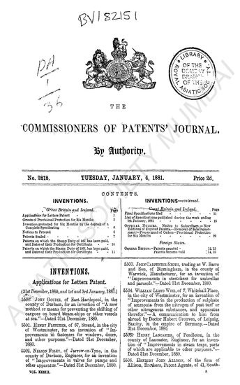 Commissioners of Patents Journal.Tuesday, Junuary 5, 18 ...