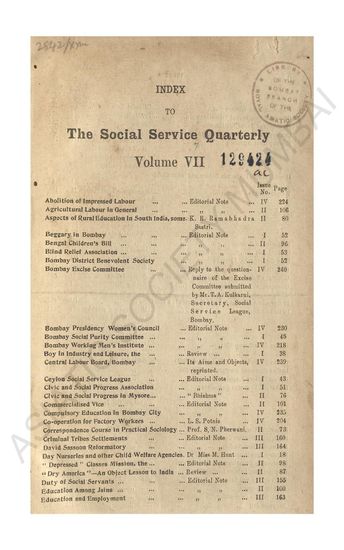 Index to The Social Service Quarterly, Volume VII, 1921