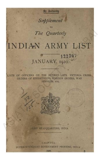 Supplement to the Quarterly Indian Army List January, 1922. Lists of Officers on the Retired Lists Victoria Croos Orders of Knighthood, Foreign Orders, War Services, Officers in Civil Employment, Staff College Graduates, Etc.