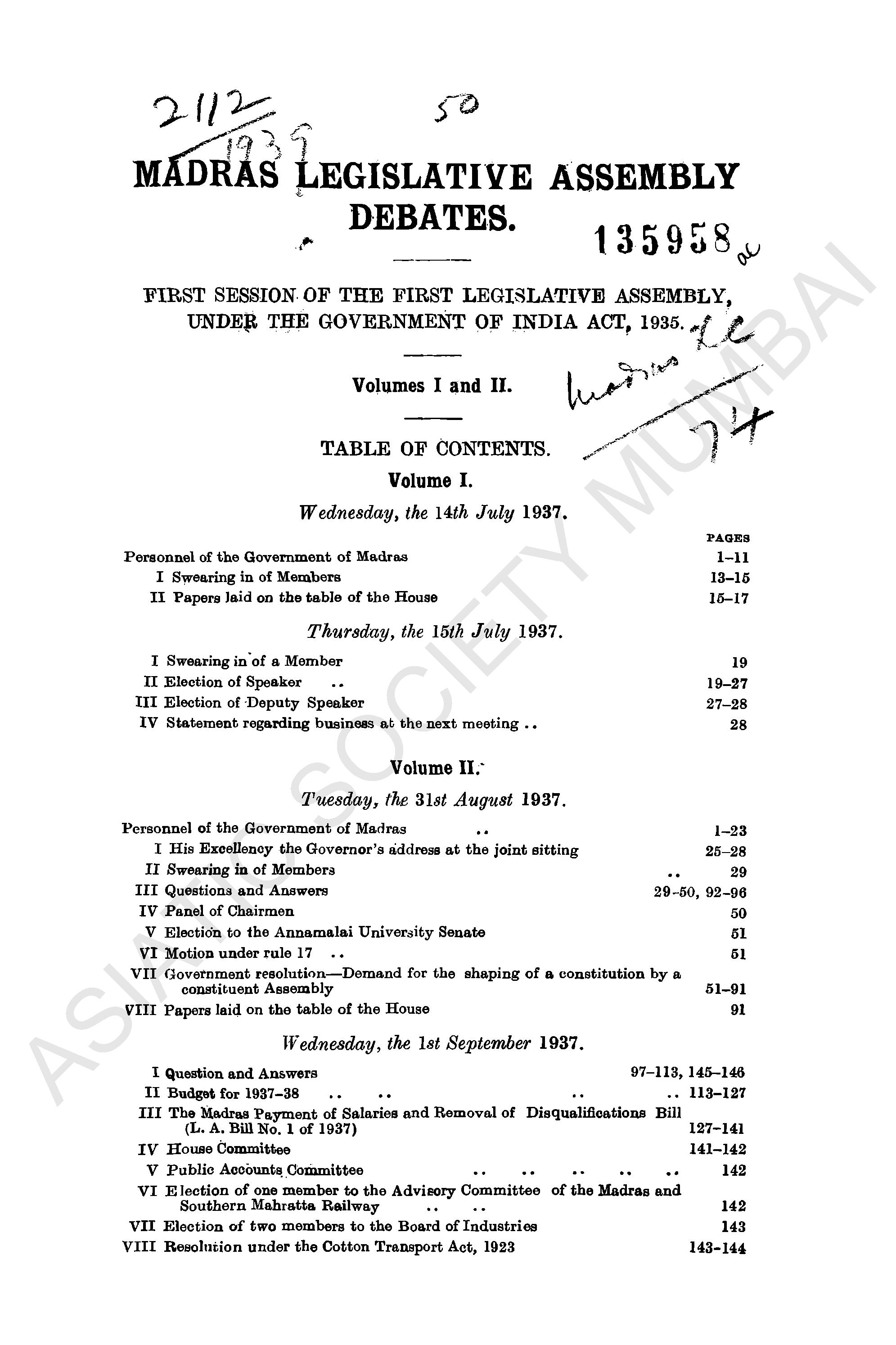 Index to Madras Legislative Assembly Debates, First Ses ...