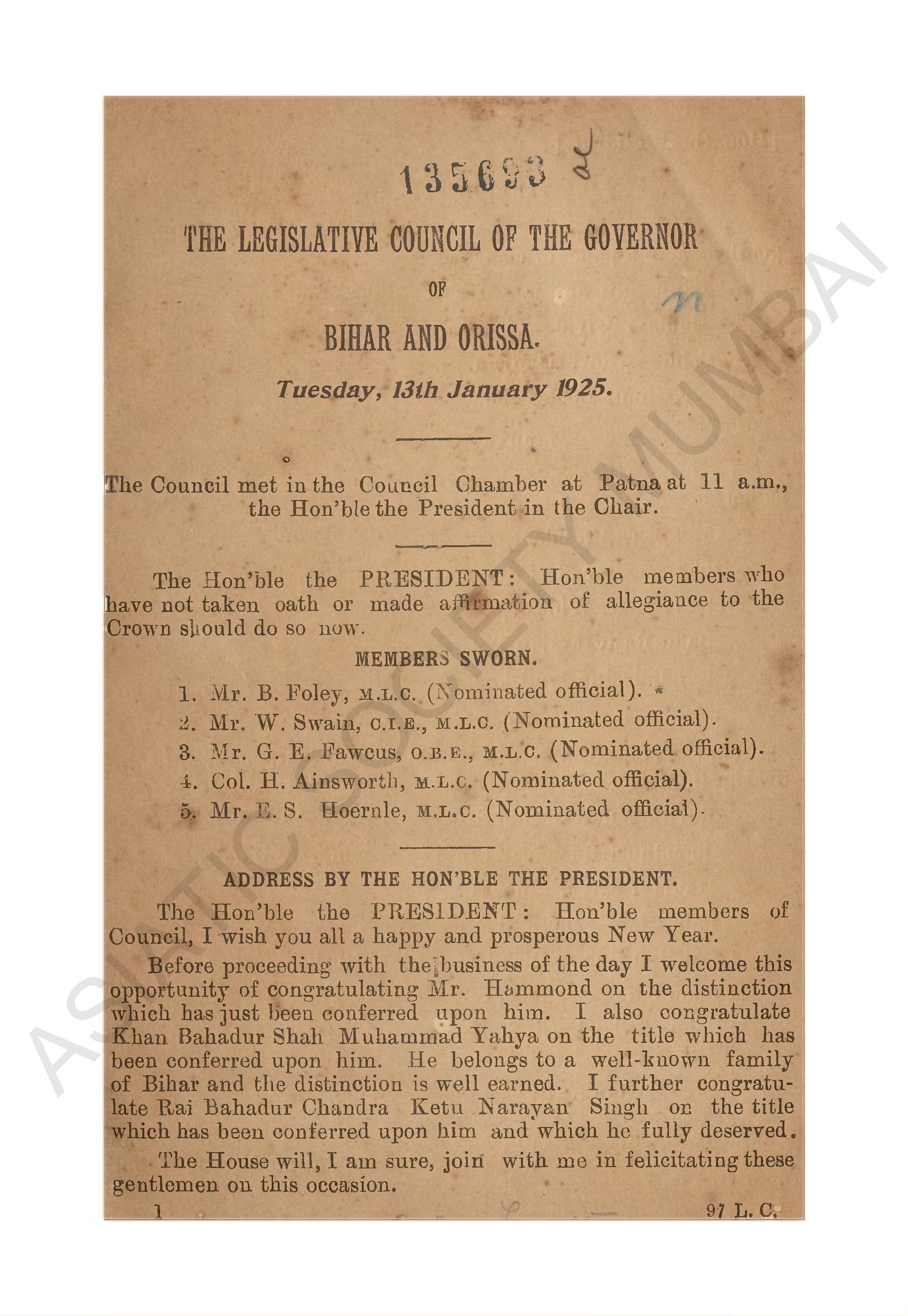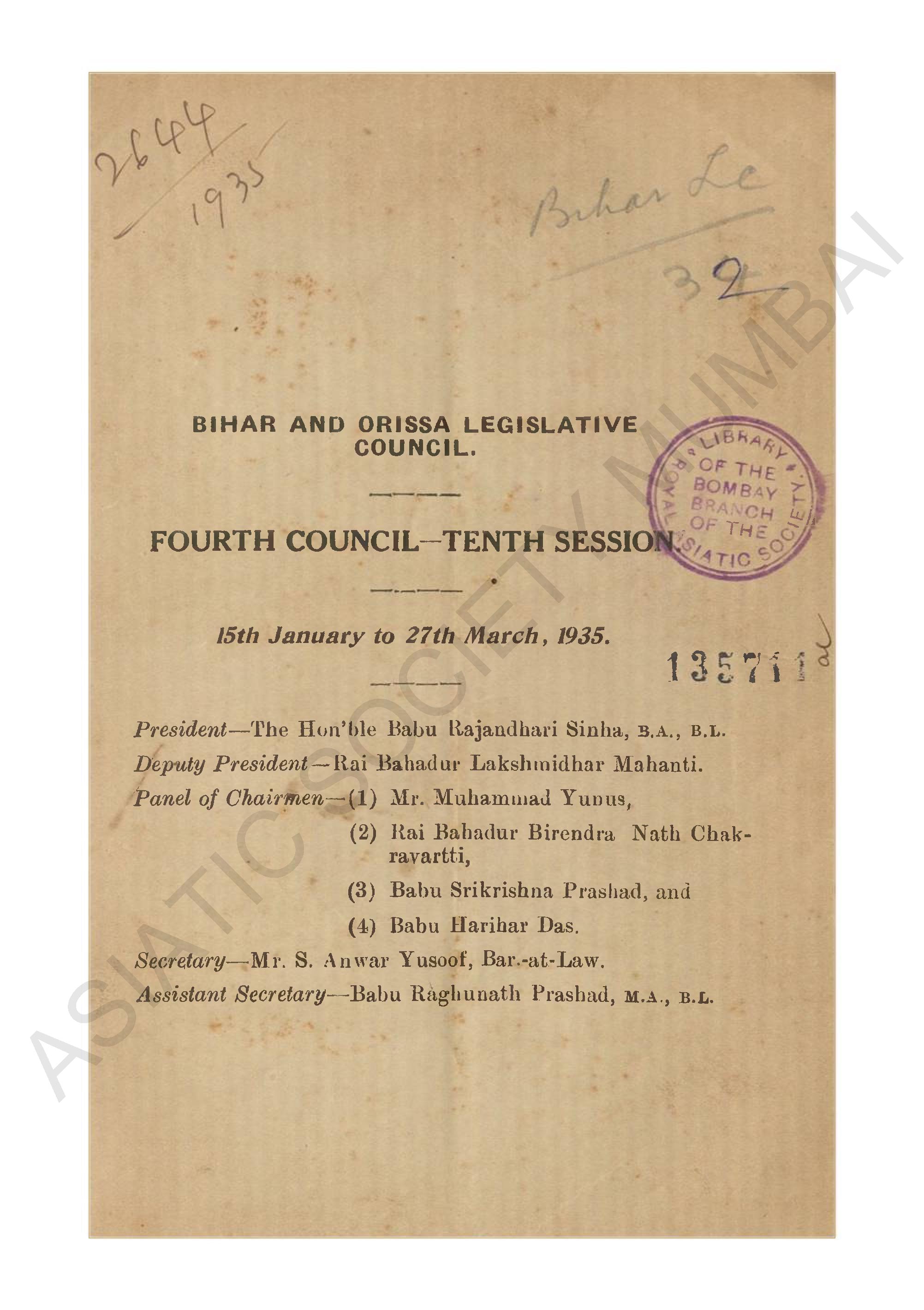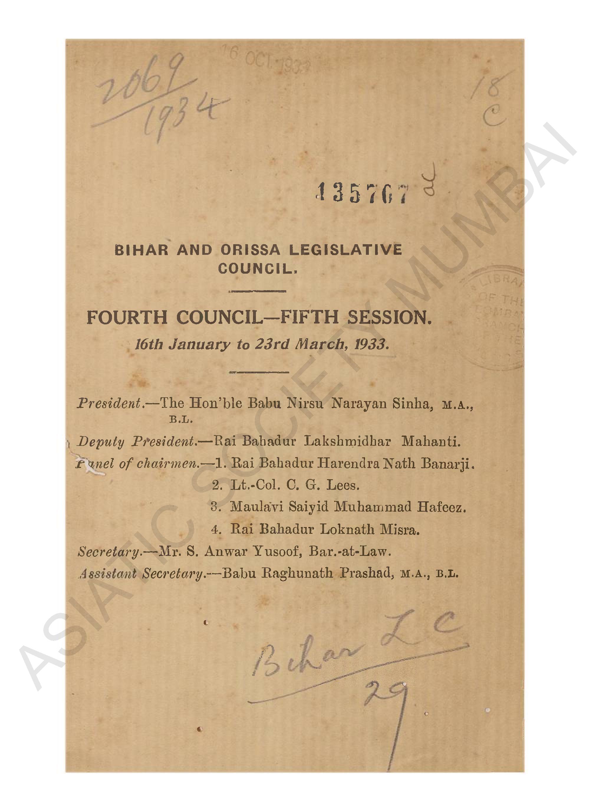 | Subject | : | India--Bihar and Orissa; Politics and government; Bihar and Orissa (India). Legislature. Legislative Council; Law |