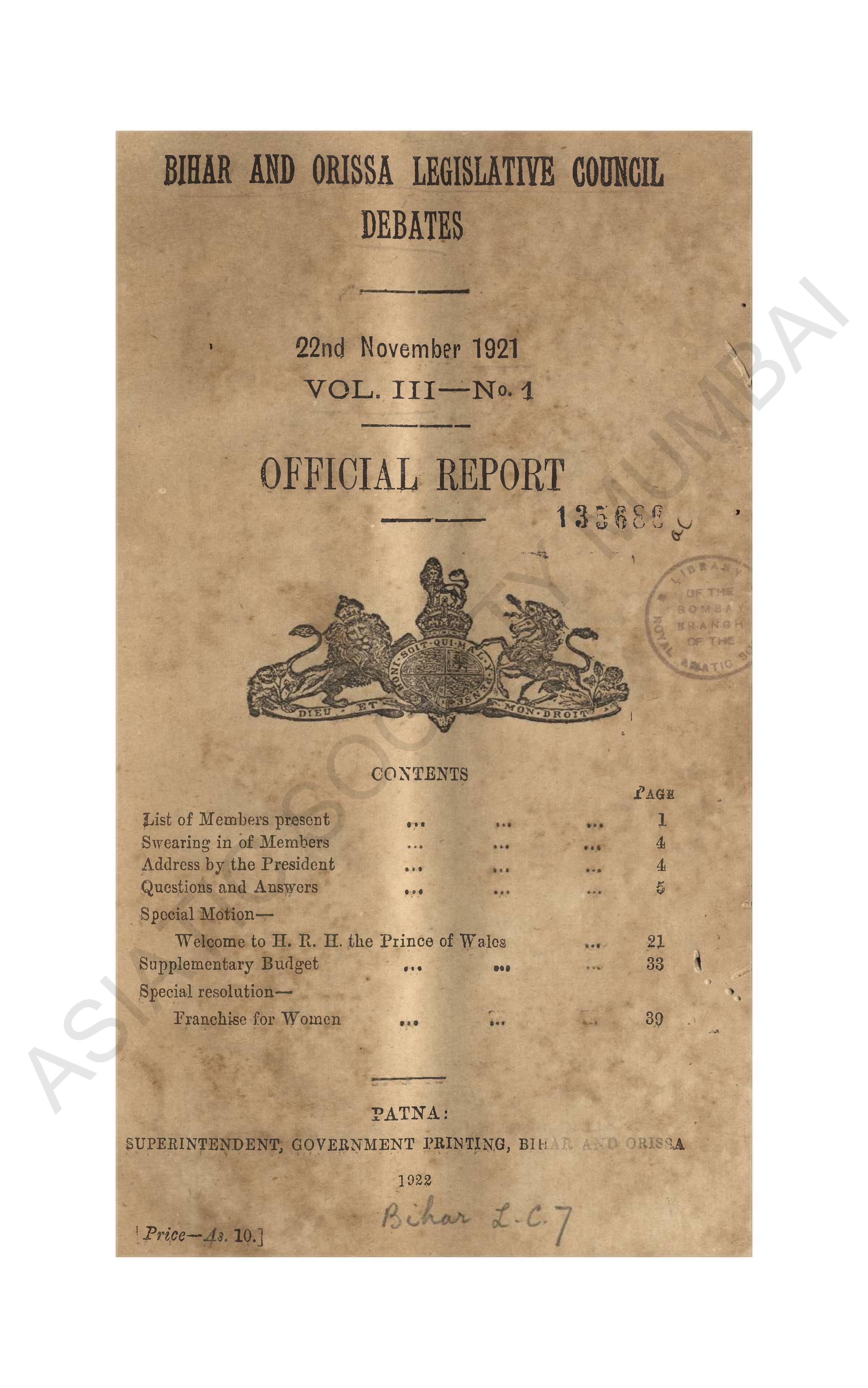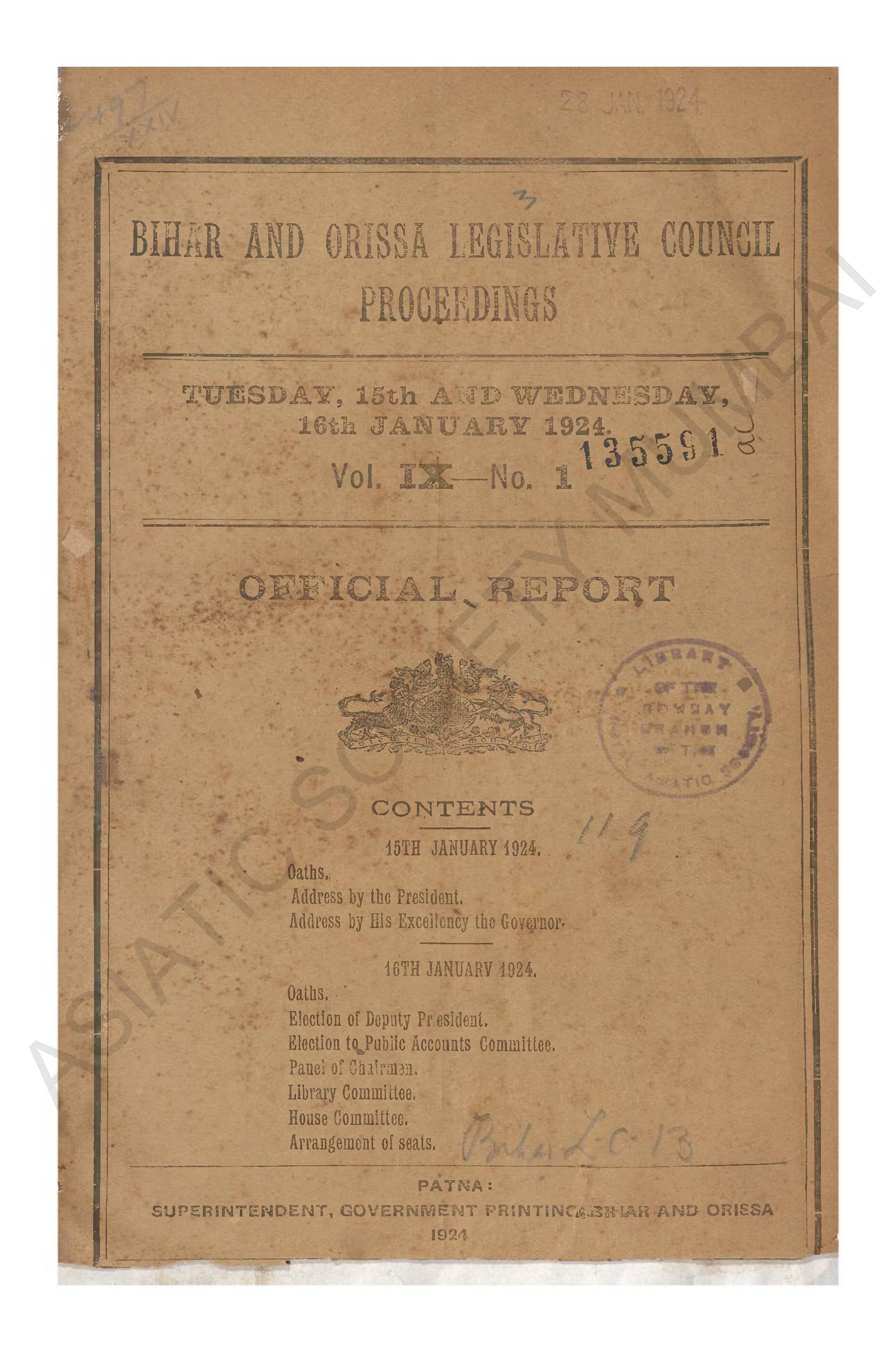 | Subject | : | India--Bihar and Orissa; Politics and government; Bihar and Orissa (India). Legislature. Legislative Council; Law |