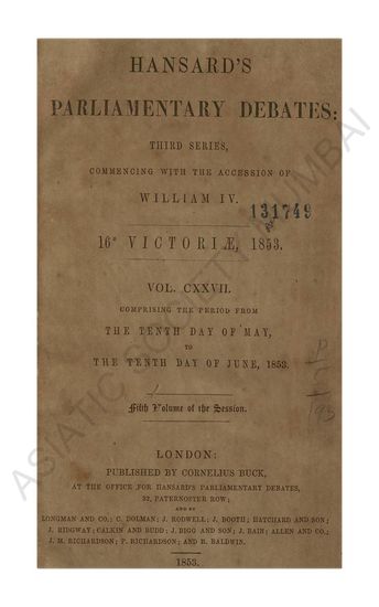 Hansard's Parliamentary Debates third series commenig with the accession of William IV 16 Victore 1853 Vol CXXV comprising the perid from the Eleventh day of March to the Eighteenth day of April 1853 Third volume of the session.