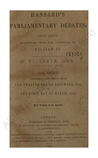 Hansard's Parliamentary Debates third series commenig with the accession of William IV 18 Victore 1855 Vol CXXXVII comprising the perid from the Second day of March 1855 to the Second day of May 1855 Second volume of the session.
