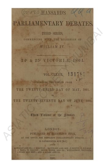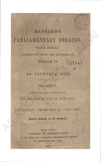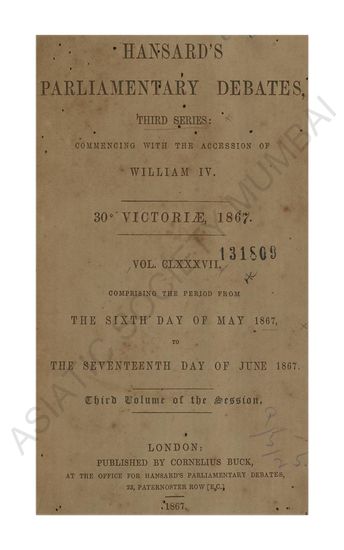 Hansard's Parliamentary Debates third series commenig with the accession of William IV 30 & 31 Victore 1867 Vol CLXXXVIII comprising the perid from the Eighteenth day of June 1867 to the Twenty-Third day of July 1867 Fourth volume of the session.