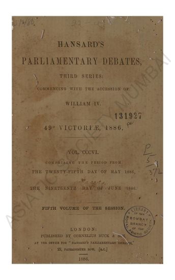 Hansard's Parliamentary Debates third series commenig with the accession of William IV 31 & 32 Victore 1867-8 Vol CXCII comprising the perid from the Eleventh day of May 1868 to the Twenty-Fifth day of June 1868 Third volume of the session.