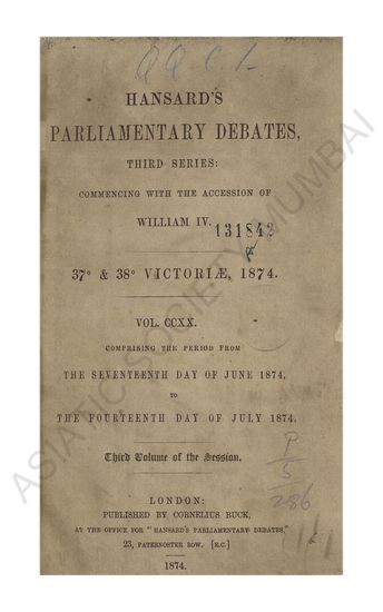 Hansard's Parliamentary Debates third series commenig with the accession of William IV 32 & 33 Victore 1868-9 Vol CXCVII comprising the perid from the Seventeenth day of June 1869 to the Fifteenth day of July 1869 Fourth volume of the session.