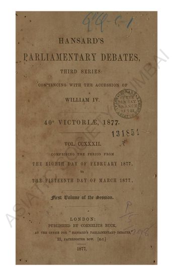 Hansard's Parliamentary Debates third series commenig with the accession of William IV 40 Victore 1877 Vol CCXXXIV comprising the perid from the Twenty-Seventh day of April 1877 to the Eighteenth day of June 1877 Third volume of the session.