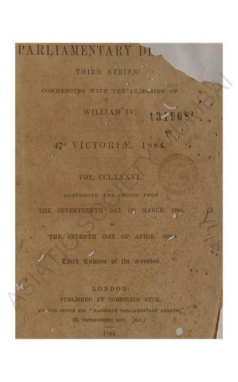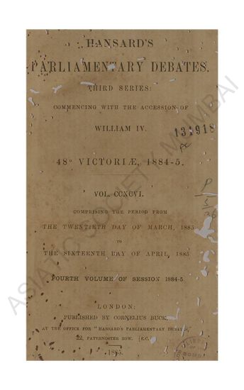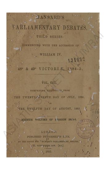 Hansard's Parliamentary Debates third series commenig with the accession of William IV 48 Victore 1884-5 Vol CCXCIV comprising the perid from the Eighteenth day of November 1884 to the Third day of March 1885 Second volume of the session.