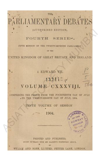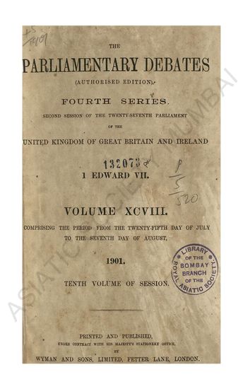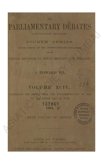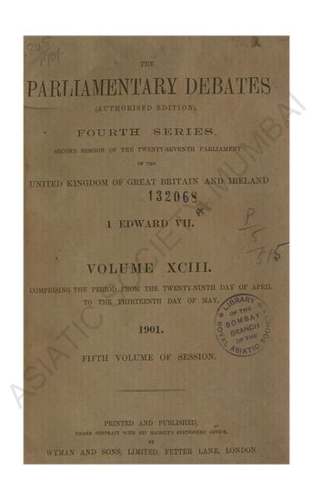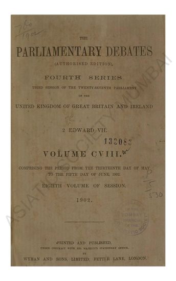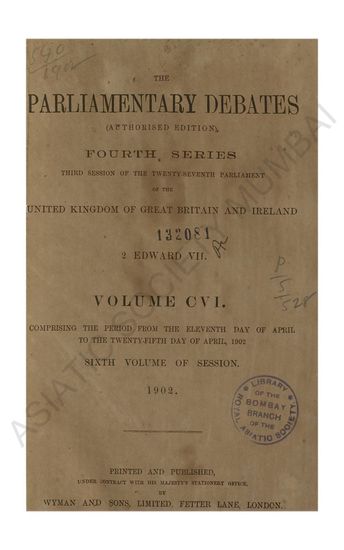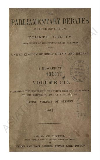Parliamentary Debates authorised edition Fourth series second session of the twenty-seventh parliament of the united kingdom of great britain and ireland 2 Edwaed VII. Volume CV comprising the period from the Fourteenth day of March to the Tenth day April 1902. Fifth Volume of session 1902.