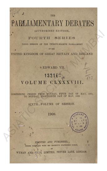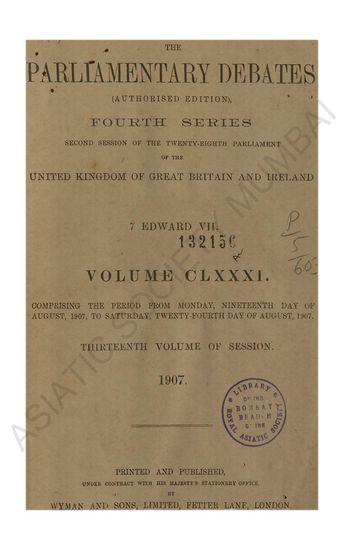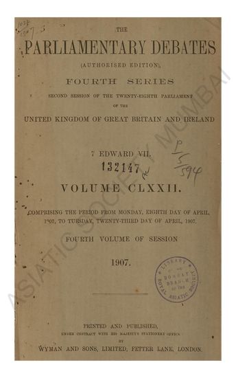 Parliamentary Debates authorised edition Fourth series second session of the twenty-eighth parliament of the united kingdom of great britain and ireland 7 Edward VII Volume VII comprising the period from Wednesday Twenty-Fourth day of April 1907, to Monday Sixth day of May 1907 Fifth Volume of Session 1907.