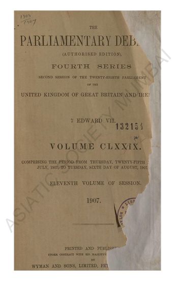 Parliamentary Debates authorised edition Fourth series second session of the twenty-eighth parliament of the united kingdom of great britain and ireland 7 Edward VII Volume CLXXV comprising the period from Thursday Thirtieth day of May 1907, to Thursday Thirteenth day of June 1907 Seventh Volume of Session 1907.
