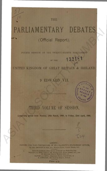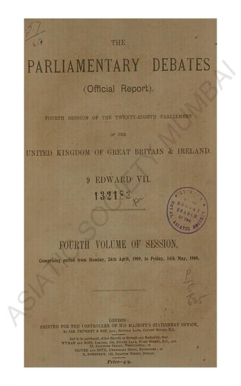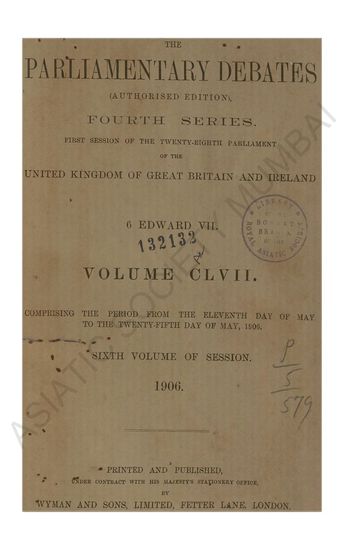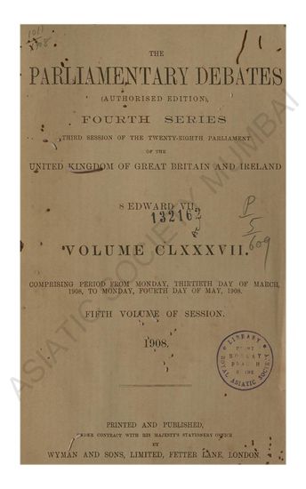 Parliamentary Debates authorised edition Fourth series third session of the twenty-eighth parliament of the united kingdom of great britain and ireland 8 Edward VII Volume CLXXXVIII comprising the period from Monday Fifth day of May 1908, to Monday Eighteenth day of May 1908 Sixth Volume of Session 1908.