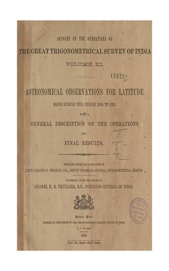 | Subject | : | General Description of the Principal Triangulation of the Southern Trigon; including the Simultaneous Reduction; and the Details of Two of the Component Series; The Great Arc Meridional; Sec. 8° to 18°; and the Bombay Longitudinal |