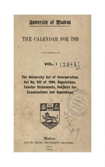 | Subject | : | The University Act of Incorporation; Act No. VIII of 1904; Regulations; Tabular Statements; Subjects for Examinations and Appendices |